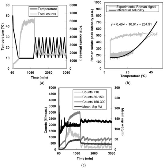 The evolution of the total counts/measurement during the experiment is shown in Figure 7a while Figure 7c shows the most significant FBRM statistics. It can be noticed that after two cycles a stable oscillatory trend for the total counts/meas. and mean of the squared weighted chord length distribution was reached. As shown in Figure 7b, the solute concentration during cycling remained close to equilibrium conditions, indicating a high yield at the end of the experiment.