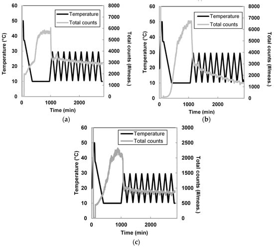 Figure 8 shows the trends for the total counts/measurement for the other three seeded cooling and cycling experiments. In all cases, a longer time was needed to reach a stable oscillating trend in the total counts/measurement compared to the seeded experiments with 2% membrane seeds. In fact, nine cycles were not enough to reach a stable oscillating trend for the antisolvent addition and 6% membrane seeds, as shown in Figure 8a,b. Figure 8c shows that in the case of the polymorphic transformation seeds, four temperature cycles were needed to reach a stable trend. The maximum amount of total counts reached after 10 h at 10 °C for this last type of seeds was around 2100 total counts/measurement, significantly lower than the maximum reached for all the other experiments (between 5000 and 7000 total counts/measurement).