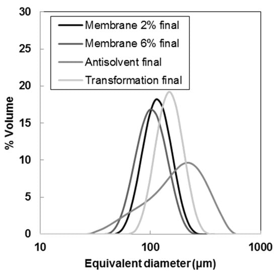 The CSDs and the main statistics for the crystals obtained at the end of the cycling experiments are shown in Figure 10 and Table 2. The highest increase in volume weighted mean diameter during the cycling experiment was observed for the membrane seeds: +243% when 2% seeds were used, and +205% for 6% seeds.