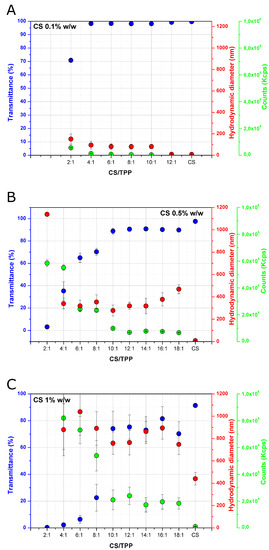 Hydrodynamic diameter (nm), counts (Kcps) and transmittance (%) of nanoparticles at different chitosan (CS) concentrations (0.1% (A), 0.5% (B) and 1% (C); w/w) and different CS/sodium tripolyphosphate (TPP) ratios prepared in 200 mM acetate buffer pH 4.5. Values are reported as mean ± SD of three independent measurements.