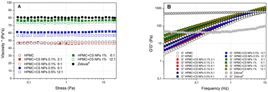 Hydrogel formulations prepared at 5.5% w/w HPMC concentration (control, CS and CS NPs 0.1% w/w, 0.5% w/w and 1% w/w) and Zidoval® were compared by looking at the rheological parameter “complex viscosity” (viscosity*). Viscosity* is a measure of the viscosity of a semisolid system obtained through an oscillatory stress sweep test (Figure 3A). Only two CS/TPP ratios (6:1 and 2:1 for 0.1% w/w CS and 6:1 and 12:1 for 0.5% w/w and 1% w/w CS) were selected for the preparation of HPMC/CS NP hydrogels, in accordance with DLS and transmittance results. Hydrogels at the two CS/TPP ratios had a similar appearance to that of nanoparticle dispersions. Specifically, the hydrogels prepared at lower CS/TPP ratios were more opaque with respect to those prepared at the same concentration but at higher CS/TPP ratios (Figure S5).