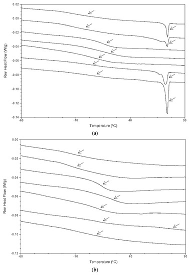 mDSC analyses were carried out using a TA Instruments Q1000 calorimeter (TA Instruments, Leatherhead, UK). Inert atmosphere was maintained in the chamber purged with a 50 mL/min flow rate of dry nitrogen. A refrigerated cooling accessory (RCS90) was used to cool the samples during analysis. Data were processed using Universal Analysis 2000 software (TA Instruments, Leatherhead, UK). The temperature and enthalpy were calibrated using indium, while the heat capacity calibration was performed at 96.85 °C using sapphire disks. About 1.5–4 mg of sample were analyzed in triplicate (n = 3) using closed standard aluminum pans (TA Instruments, Leatherhead, UK). Samples were heated at a rate of 2 °C/min combined with a modulation of ±1 °C and a 40 s interval period. The chosen modulation parameters were validated using Lissajous figures. The inflection point temperature was used to report the Tg value. The Tg width was estimated as the distance between the onset and end of the transition region.