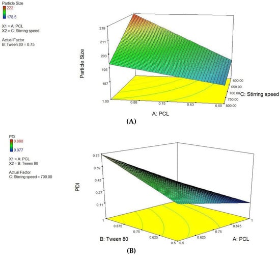 Surface response plot showing influence of: (A) PCL and Stirring Speed on Particle size; and (B) PCL and Tween 80 on PDI.