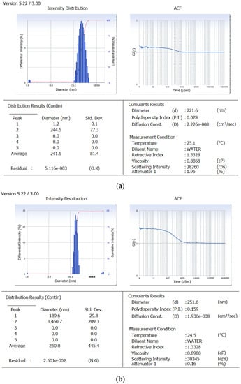 Particle size image of: (a) NAR-PCL-NP; and (b) NAR-HA@CH-PCL-NP.