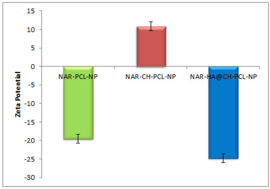 Zeta potential of NAR-PCL-NP, NAR-CH-PCL-NP and NAR-HA@CH-PCL-NP.