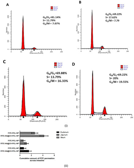 (i) Representative cell cycle distribution in A549 cells after treatment with: (A) control; (B) blank HA@CH-PCL-NP; (C) NAR; and (D) NAR-HA@CH-PCL-NP, at sub IC50 drug concentration. Analysis was performed using flow cytometry. Each figure individually represents the population present in G1-S and G2-M phases. (n = 3) (p < 0.05). (ii) Ex vivo permeation study of FITC loaded nanoparticles through rat intestine.