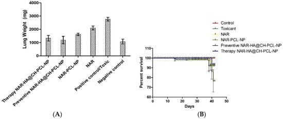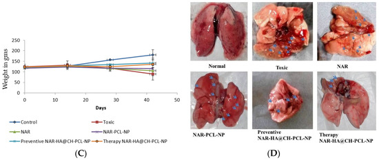 The preventive and therapeutic effect of NAR-HA@CH-PCL-NP was compared with NAR and NAR-PCL-NP in in vivo urethane-induced tumor model. In preventive group, the dose was started 15 days prior to the induction of tumor as a result of carcinogen exposure. At the end point of study i.e., 21 days for Control, NAR, NAR-PCL-NP and therapy NAR-HA@CH-PCL-NP and 35 days for preventive NAR-HA@CH-PCL-NP after the start of treatment, the rats were sacrificed and the lungs were isolated. The lung weight was recorded and tumors were localized in the organ. Both preventive and therapeutic NAR-HA@CH-PCL-NP group displayed major regression in tumor marked by comparative low lung weight, whereas NAR-PCL-NP displayed minor regression in tumor at the end point of experiment (Figure 8a–d). The results revealed a significant enhancement of therapeutic efficacy (p < 0.1) when compared to toxic group. Survival plot depicted a significant reduction in animal death in both therapeutic and preventive therapy through NAR-HA@CH-PCL-NP when compared to toxic group (p < 0.05). Weight variations plots for test animals during study duration showed depressed weight reduction in test animals on therapeutic and preventive therapy NAR-HA@CH-PCL-NP as compared with toxicant, NAR and NAR-PCL-NP groups. The effect is correlated to the antioxidant potential of NAR for preventive activity and reported mechanism of reducing MMP-2 and -9 in lung cancer cells to inhibit cell proliferation.