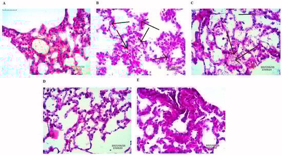 Lung tissues from all the five groups were stored in 10% buffered formalin for histopathology. The tissues were usually processed, entrenched with paraffin wax, and sectioned (3–5 μm) via rotary Microtome (YSI-060 Yorco, Ghaziabad, India). Sections thus obtained were unflustered over the glass slide, deparaffinized, and stained with hematoxylin and eosin. The sections of the specimen were observed and photographed at 40× using digital biological microscope (N120, BR-Biochem Life Sciences, New Delhi, India.
