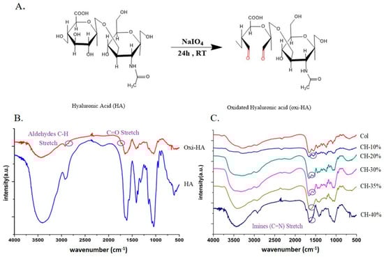 (A) Chemical schematic of hyaluronic acid oxidation oxidized by sodium periodate; the newly formed aldehyde group is expressed in red color [37]; (B) FTIR Spectra of hyaluronic acid (red) and oxidized hyaluronic acid (blue); and (C) collagen (Col) and oxi-HA/collagen (CH) at different weight ratios (w/w).