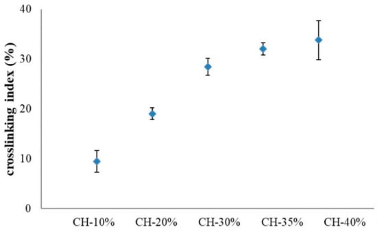 Crosslinking index of CH hydrogels made from oxidized HA/collagen at different concentrations (w/w). Error bars represent standard deviations of triplicate measurements.