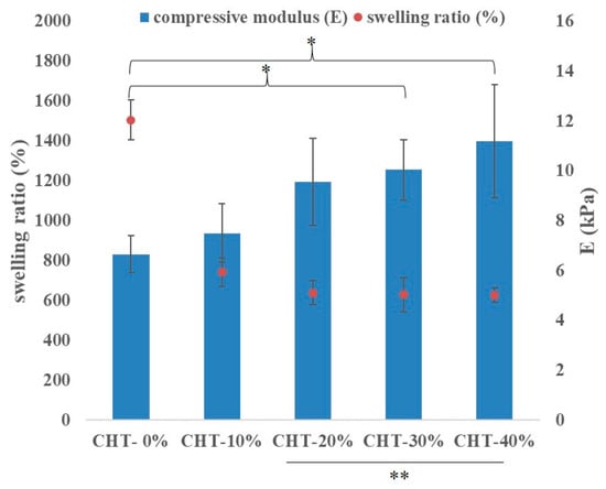 Swelling ratio (%) (data collected at soaking time of 120 min) (left y-axis) and compression modulus (E) (right y-axis) of CHT with different β-TCP content. Error bars represent standard deviations of triplicate measurements. * indicates a significant difference (p < 0.05). ** represents no significant difference (p > 0.05).