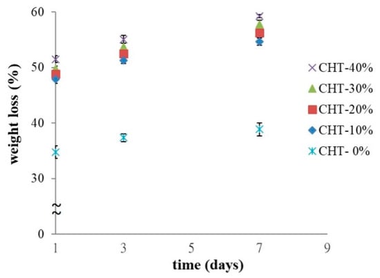 Effect of the amount of β-TCP added on the degradation percentage of CHT composite materials. Error bars represent standard deviations of triplicate measurements.