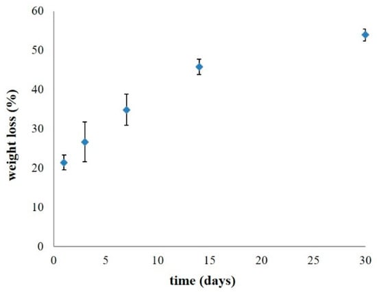 where Wf is the measured dry weight of the lyophilized hydrogel samples after soaking in 1.0 mL of PBS in thermostat shock sink at 37 °C, 50 rpm for different days (i.e., 1, 3, 5, 7, 10, 15, 20, 25 and 30 days). All experiments were performed in triplicate and the degradation results were presented as weight loss % in the following sections. In this study, the degradation percentage versus the time were applied as the desired indicator for drug release control [31,32], with more detailed information regarding the proposed degradation mechanisms of our material to be investigated and discussed in the near future.