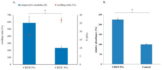 In this section, CHT-30% was applied with 5% OPCs as cross-linker for the rest of the tests, which could be called CHTP or CHTP-5%; when CHT-30% was used alone without the OPCs applied, it could be called CHTP-0% as a control sample. Here, as shown in Figure 7A, the effect of 5% of OPCs added resulted in stronger interactions between polymer chains as well as a reduced swelling percentage compared to the control sample, CHT-30% (or CHTP-0%). This reduction in swelling percentage thus induces greater compression strength in the overall hydrogel-based composites, with the compression modulus increasing when OPCs were applied. This enhanced mechanical property was also beneficial to the alveolar bone reconstruction during tissue engineering [8].