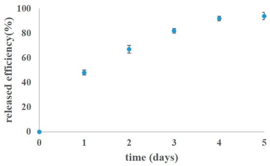 where Mt and Vt represent the released drug concentration and the collected drug solution volume at each time interval, respectively. The released efficiency of the drug release test was then defined as: