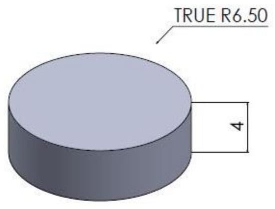 FFF using F11 and formulations labelled “3DP” from Table 2 as feedstock material was carried out using a commercial desktop 3D printer, MakerBot Replicator 2× (Makerbot® Industries, New York, NY, USA). The printing conditions for the most aesthetic and robust tablets were kept constant by using the following parameters: extrusion speed (10 mm/s), extruder temperature (150 °C), printing bed temperature (50 °C), extruder travel speed (50 mm/s), number of shells (1), roof and floor thickness (0.5 mm), layer height (0.2 mm), and infill 25% in which the linear infill pattern and the raft and support options were turned off. A total of 40 tablets were printed using these settings without any operator intervention after setup. The process was completed in 44 min. The three-dimensional design for a flat-face plain tablet was created using SolidWorks 2014 (Dassault Systèmes, Waltham, MA, USA) and saved as an STL extension format (see Figure 1). The STL file was opened using the monitor and remote control software suite MakerBot Desktop (Makerbot® Industries, New York, NY, USA).