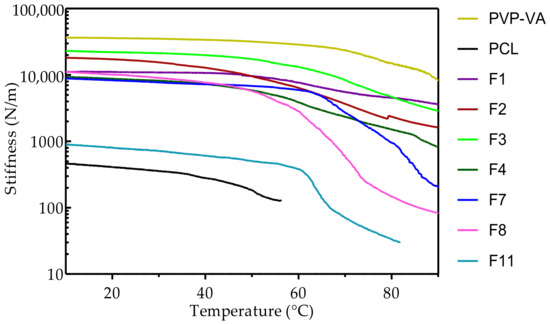 Filament stiffness over no minimal FFF working range of a select number of melt-blended formulations are shown in Figure 2. The nominal working range reflects the temperature range the filament experiences as feed above the driving gear (room temperature) and as a piston below the driving gear (above 30 °C). Addition of 10% (w/w) of the recommended plasticizer P188 (F1) decreased PVP-VA stiffness at room temperature by 69%. Melt-blending with either PEO or PCL significantly decreased room temperature filament stiffness (p < 0.05). A 10% (w/w) addition of PEO (F3) decreased PVP-VA stiffness by just over 66%. PVP-VA stiffness decreased by 48% in addition of 10% (w/w) PCL (F2) and continued to decrease (75%) with double the amount of PCL (F4). Binary blends of higher amounts of PCL had no further effect on the PVP-VA room temperature filament stiffness. PVP-VA was over 200 times stiffer than PCL (306 N/m). Stiffness readings could not be made for PCL at temperatures above 56.05 °C since the polymer had started to melt. At higher piston temperatures, PVP-VA maintained a constant stiffness up until an inflection point (onset temperature) of 68.66 °C. Above this temperature, stiffness steadily decreased with increasing temperature. While higher PCL content did not significantly affect room temperature stiffness (p < 0.05), the higher the PCL content, the steeper the decline in stiffness was with rising temperature. For the final formulation (F11) addition of 10% (w/w), PEO significantly decreased the stiffness across the entire working temperature range. Above 60.0 °C, there was an abrupt drop-off in filament stiffness for the final F11 formulation.