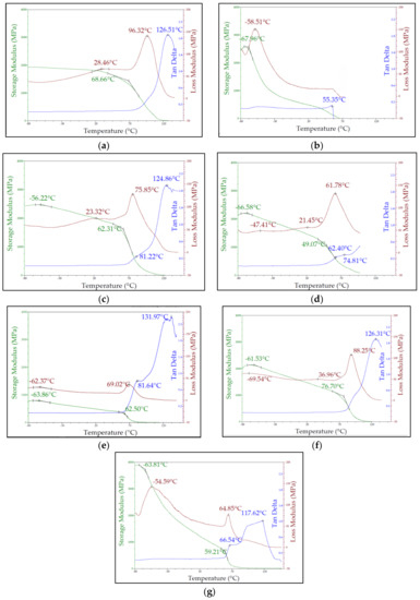 Tan δ peaked at 126.68 °C for PVP-VA (see Figure 3a), but it is not clearly observed for PCL due to a noisy signal starting at 55.35 °C caused by the onset of melting. For F2, the peak at 121.69 °C corresponds to that of PVP-VA (see Figure 3c). There is no peak for F4 at the higher temperatures but a shouldered peak is observed around 74.16 °C (see Figure 3d). F7 displayed a more pronounced shouldered peak at 81.09 °C after which a crest formed at 131.97 °C (see Figure 3e). At 50% (w/w) PCL content, the shouldered peak was not observed but a strong, sharp peak was observed at 125.54 °C (see Figure 3f). The shouldered peak was present at 67.48 °C in the F11 sample, but the machine could not properly measure data points at higher temperatures (see Figure 3g).