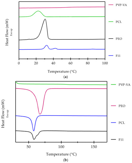 Figure 4 shows the DSC thermograms of cooling (a) and heating (b) for PVP-VA, PCL, PEO, and the final formulation F11. PVP-VA is amorphous and thus did not generate a melting peak. The glass transition (Tg) temperature of the polymer was 100.1 °C, which calculated from relaxations observed in DSC thermograms (Figure 4b) (n = 4) and is close to the peak observed at 96.32 °C in the loss modulus (see Figure 3a). A melting peak was observed at 57.9 °C for PCL while crystallization happened at 21.1 °C. PEO melted at 67.5 °C and solidified at 31.1 °C. The main melting peak for F11 occurred at 57.0 °C with a small shoulder at 62.2 °C. The main peak would represent the PCL portion of the ternary blend while the shoulder would represent the 10% (w/w) PEO portion. From the cooling cycles, two solidification peaks are observed at 30.4 °C and 43.2 °C, which would again represent PCL and PEO, respectively. A 5% (w/w) caffeine loading to F11 did not produce a melting peak at 235 °C to 237 °C and it did not alter the MFI values of the formulation. Therefore, further characterization is beyond the scope of this body of work (data not shown).