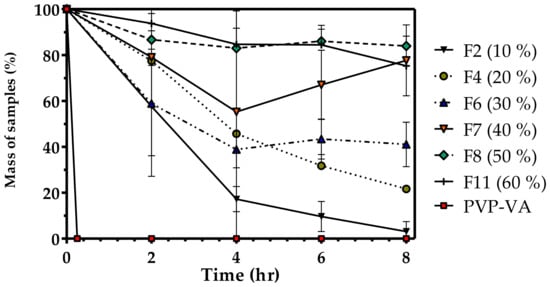 The mass loss of select blends was measured over a period of 8 h to ascertain the effect of changes in material formulation on the disintegration profile of PVP-VA. Figure 5 shows the remaining mass (%) over time of a formulation filament in biologically relevant media. PVP-VA was shown to completely disintegrate within the first two hours, which would be expected for a polymer designed for immediate release applications. Adding PCL to the formulation slowed the rate of mass loss. Adding 10% (w/w) PCL reduced mass loss to 42.4% in the first 2 h by increasing to 82.8% at 4 h and only a tiny 3.1% portion remained after 8 h. Doubling the amount of PCL to 20% slowed mass loss even further, and after 4 h, more than twice the amount of mass remained (45.7%) compared to the 10% PCL sample. After 8 h, more than a fifth of the mass remained (21.7%) for this formulation. At higher PCL loadings, the linear pattern stopped. The sample containing 40% PCL is of particular note since it lost 44.8% mass after 4 h but regained 11.8% after 6 h. The formulations with a content of 50% (w/w) PCL and more displayed a slower rate of dissolution in media with more than 75% of their mass still intact after an 8 hour-period.