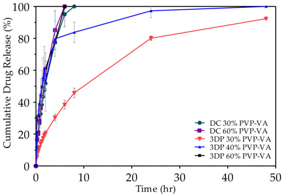 The influence of material formulation and tablet manufacturing processes on drug release over 48 h is shown in Figure 6. Two compressed tablets of different formulations (30% and 60% (w/w) PVP-VA content) both released over 75% drug content after 6 h. Similarly, a 3D printed tablet containing 30% (w/w) PVP-VA released 78.3% drug after 6 h. There was no significant difference in the release profiles of these three tablets (p < 0.05). The presence of PCL in the formulation slows caffeine drug release and the immediate release properties of PVP-VA. A PVP-VA compressed tablet released 100% drug in under 1 h (data not shown). For a 40% (w/w) PVP-VA 3D printed tablet, the cumulative release was not significantly different for time points up to 6 h. Beyond this point, the cumulative release from the tablet slowed significantly compared to other tablets. After 8 h and 24 h, the tablet had released 83.8% and 97.3% drug, respectively. There was a significant difference in the release profile of the 30% (w/w) PVP-VA 3D printed tablet and the other tablets at almost all time points. After 6 h, this tablet released 38.5% of the drug with 50.1% release of the 30% (w/w) PVP-VA 3D printed tablet. After 24-h release increased to 80.1% and, after 48 h, the release was 92.3%.