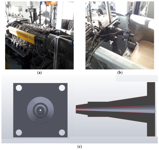 Depiction of machinery used for the fabrication of formulations described in this body of work: (a) twin-screw extruder, (b) mounted die attachment on extruder flange, and (c) schematic of die attachment.