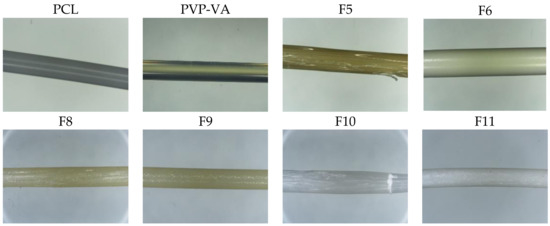 The front orifice of the die attachment was designed with a diameter of 2.30 mm, which allowed the extruded filament to be larger than needed so that control of the filament diameter was completed through subsequent unidirectional stretching by the haul-off units. Since we did not have access to a melt-pump system, compensation for extrusion surging was through operator control of the haul-off speed. The extrudate filament was cooled through a system of air knives and not through a water-bath to prevent erosion of the water-soluble polymer filament and drug loss. The haul-off system was in two stages: a first Teflon belt at a 45° decline with air knife cooling and a second twin belt conveyor that was the dominant haul-off controller. Figure 8 shows the physical appearance of a select number of filaments produced during HME trials. The majority of formulations gave filaments with a rough surface, which is indicative of the onset of sharkskin. The sharkskin appearance is indicative of instabilities in the flow exiting the die [67] and is probably related to the immiscible portions of the melting portion. Higher die temperatures may have resolved the issue. Both polymers, PVP-VA and PCL, and F6 all produced filaments with a smooth surface with no sign of sharkskin, which suggested stable melts at these processing temperatures [67]. For the most part, the die attachment reduced surging from the twin-screw extruder, but some operator intervention was still required to maintain tolerances. Addition of 10% (w/w) PEO had the unexpected benefit of almost eliminating extrusion surging in the final 60% (w/w) PCL formulation.