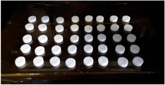 Figure 9 shows the finished print of a complete batch of tablets. Part of the pre-screening process is to calculate the length of filament required to print a complete batch of 13 mm diameter tablets. Most printer software will pause a print mid-run to permit changing of the filament and, therefore, it is not an insurmountable issue, but from a purely practical point-of-view, it is important to be aware of how large of a batch can be printed from a single filament length. Equation (3) was used to calculate the density (Db) of the ternary blend F11 (0.001141 g/mm3). The total volume (VT) of forty 4 mm high (cylinder) tablets was 21,237.16 mm3 (Equation (4)) where is the total height of sample tablets combined and rs is the radius of the tablet. The total mass (MT) to print forty 100% infill tablets was calculated at 24.23 g (Equation (5)). Finally, the length of required 1.75 mm diameter filament to print forty 100% infill tablets could be calculated as 8829.32 mm using Equation (6) where rf is the radius of the filament. We refer to this as the minimum batch length (LB). The filament length should be adjusted for the percentage infill (x) of samples, e.g., 0.25 for a 25% infill, which reduces the length to 2207.33 mm. In addition, to account for variation in filament diameter and the material needed for the outer shell, a correction factor of at least 1.3 should be applied, which would bring the minimum batch length (LB) for these tablets to 2869.53 mm. In further criteria, we set any material formulation is the minimum sample length (LS), which is the minimum filament length to print a single sample without operator intervention. The LS for this design of flat-face tablet with 25% infill is 71.74 mm. We consider LS to be the minium criteria of viability for any material formulation for the FFF process. PVP-VA could not pass this minimum criteria (LS) due to brittleness. F5 was the first formulation to pass this criteria, but only F11 could succeed in passing the minium batch length (LB) and provide a filament in excess of 8.83 m. To achieve the LB required for the quite high PCL content, it ultimately reduced the drug release rate (see Figure 6). Therefore, printability versus the drug release profile is a choice that can guide future formulation. We can maintain more of the immediate release properties of PVP-VA by reducing PCL content but at the cost of the filament length and subsequent batch size. Ls is the limit at which PCL content can be reduced.