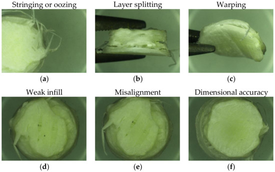 Figure 10 shows examples of the main types of part failure during the FFF process. Stringing (see Figure 10a) occurs when excess material on the nozzle is dragged from the part during manufacturing. The problem is more pronounced for materials with a high melt strength that will readily allow for stretching of molten beads. Some printing software has a ‘retraction’ countermeasure setting that eases back pressure in the extrusion head to prevent oozing from the nozzle during print head travel. Other reasons that could cause this flaw are two high nozzle temperatures that cause low material viscosity over extrusion of material and slow cooling of deposited material due to high print bed temperatures. Layer splitting (see Figure 10b) occurs due to inadequate layer coalescence during deposition. The polymer chains in the depositing molten layer must intermingle with the polymer chain of the previous layer to achieve proper coalescence. If adequate coalescence is not achieved, then during cooling, elimination will occur and layers will split apart. Higher printing and print-bed temperatures will overcome this issue since lower viscosities and softening of printed layers will both promote coalescence. Warping (see Figure 10c) is a phenomenon that is not restricted to FFF but occurs in other processes including injection molding [69]. In the FFF process, it occurs due to poor adhesion of the base layer to the print-bed and when subsequent layers are deposited on top. Internal stress between the layers of the print causes the part to warp and curl away from the print-bed surface. One of the main reasons for warping is the too low print-bed temperature that creates an excessive thermal gradient [70].