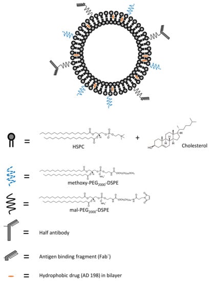 Components of developed long circulating CD22 targeted liposomal AD 198 drug delivery system (HSPC: hydrogenated soy phosphatidylcholine, methoxy-PEG2000-DSPE: 1,2-distearoyl-sn-glycero-3-phosphoethanolamine-N-[methoxy(polyethylene glycol)-2000], mal-PEG2000-DSPE: 1,2-distearoyl-sn-glycero-3-phosphoethanolamine-N-[maleimide(polyethylene glycol)-2000].
