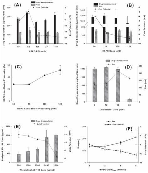 (A) Effect of lipid composition on AD 198 encapsulation and liposomal size; (B) Effect of total phospholipid concentration on liposome size, ζ-potential and AD 198 encapsulation; (C) Optimization of HSPC concentration; (D) Effect of cholesterol concentration on AD 198 encapsulation and liposome size; (E) Effect of AD 198 concentration on AD 198 encapsulation and ζ-potential; and (F) Effect of mPEG2000-DSPE concentration on ζ-potential and liposome size.