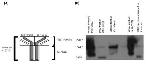 (A) Verification of anti-CD22 Fab’ conjugation; (B) Verification of conjugation of anti-CD22 Fab’ by western blotting.