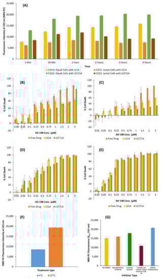 To confirm that the mechanism of uptake of LCCTLA particles into Daudi cells was by receptor-mediated endocytosis cellular association studies were performed []. Briefly, 10 mL of Daudi cells at a cell density of 7 × 105 cells/mL were grown in two separate T25 flasks. One was pre-cooled to 4 °C and then treated with 1 µM fluorescent LCCTLA for one hour and the other was treated with 1 µM fluorescent LCCTLA at 37 °C for one hour. At the end of the time point, the cells were centrifuged at 4 °C and 100 g for 4 min. The pellet obtained was washed with 1× PBS thrice and the final cell pellet was re-suspended in 1 mL of 1× PBS and tested for fluorescence intensity for NBD-PC per 10,000 cells using the BD Accuri™ C6 Flow cytometer.