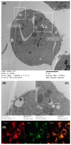 To confirm that the intracellular vesicles the magnetic liposomes were observed in were endolysosomes, cells were stained with endolysosome specific dye [,,]. Briefly, 10 mL Daudi cells were cultured to a cell density of 7 × 105 cells/mL and treated with 10 µL of placebo fluorescent CD22 targeted liposomes (prepared by substituting 0.125 mole % of HSPC with an equal mole % of NBD-PC, and not loading any drug) for 1 h. During the final 5 min of treatment, 50 nM LysoTracker® Deep Red was added to the treated cell culture. The media was then removed by centrifugation and the cell pellet thus obtained was washed 3 times using 1× PBS. The final cell pellet was suspended in a single drop of Vectashield® cell mounting medium with DAPI. This final cell suspension was mounted onto a microscope slide and covered by a Fisherbrand number 1 coverslip. The slide was allowed to dry in a fume hood for approximately 30 min and the edges were sealed using a transparent nail polish. The nail polish was also allowed to dry in a fume hood for another 30 min after which the slide was viewed under a Nikon Eclipse E800 confocal scanning laser microscope (Nikon Instruments, Melville, NY, USA). The lasers were set at the wavelength for NBD-PC, LysoTracker® Deep Red and DAPI and images were obtained.