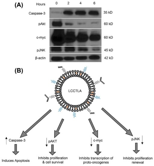 To study the efficacy of the drug delivery system on induction of apoptosis in the cancer cells, the cells were treated with the LCCTLA and the expression of 4 proteins was monitored, Caspase 3, c-myc, p-JNK, pAKT. β-actin was used as a control to signify equal loading. The process [] has been briefly outlined below.