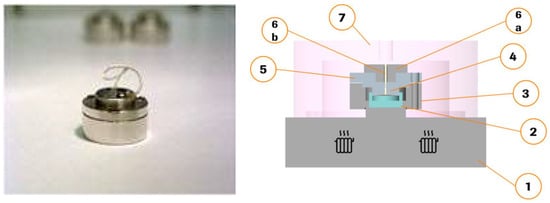 Device used for miniaturized extrusion (left photography, right schematic representation). 1—Hot stage, 2—Container, 3—Chassis, 4—Piston, 5—Cover, 6a—Nozzle, 6b—Tubing, 7—Vacuum cap.