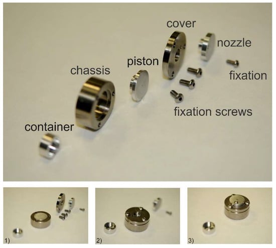 Assembly and extrusion with the MinEx device: The construction plans of all MinEx building blocks are shown in the Appendix, (Figure A1, Figure A2 and Figure A3). Each extrusion nozzle was assembled from four separate main parts. The ring-base was first locked with the piston. An adaptor ring was then fixed with three screws on the base; the extrusion nozzle was mounted on top of all and fixed by use of a single and slightly smaller screw. The filled and well-dried containers were placed on the heating stage and closed with the extrusion nozzle. The extrusion nozzle plunged the container (Figure 2). This whole arrangement was then covered and sealed with a vacuum cap, brought to high vacuum and slowly heated. At a temperature of T = 140 °C the cap was flooded with air and removed. At T = 160 °C the extrusion was initiated by a hand press; the extrusion nozzle was pressed against the container to confine and to extrude a viscous melt. The material was cooled at room temperature. The obtained miniaturized extrudates were characterized by atomic force microscopy (AFM), X-ray powder diffraction (XRPD), differential scanning calorimetry (DSC), fourier transformed infrared spectroscopy (FTIR) and dissolution testing.