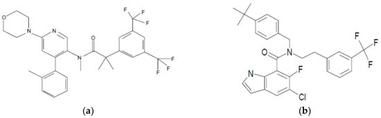 Chemical structure of neurokinin-1 receptor antagonist (NK1) (a) and cholesterylester transfer protein inhibitor (CETP) (b).