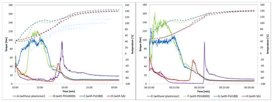 Pol188 and PEG4000 beneficially modulate the viscosity-temperature profile. Interestingly, all profiles appear comparable from a quantitative point of view (Figure 4). Being better soluble in both binary mixtures, they are expected to have a different mode of plasticizing action than SA, they are primary plasticizers [14]. Once Pol188 or PEG4000 are molten other components start to dissolve in a steadily present fluidic-viscous phase and this phase is expected to systematically grow with temperature and mixing shear.