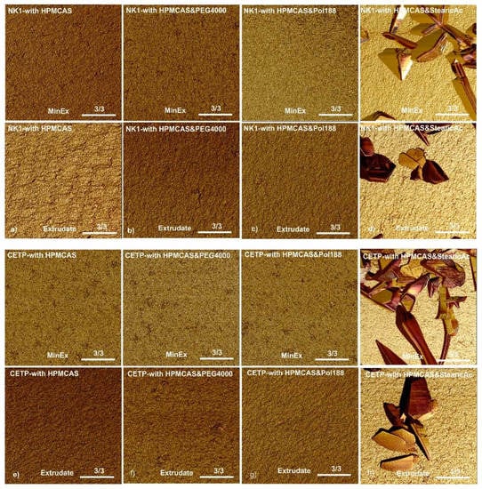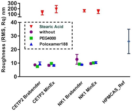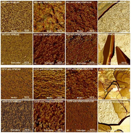 The phase maps recorded with tapping mode AFM after humidity-temperature stress storage for 2 h at T = 40 °C and relative humidity (RH) = 75%RH were inspected for patterns indicative for de-mixing or phase separation processes. Ten regions on each of the 16 extrudates were inspected and the results are presented in Figure 10. Independent of whether originating from MinEx or the lab-scale processes, whether they contain NK1 or CETP, all systems which contained PEG4000 and Pol188 were poorly stable, because spinodal nucleation patterns were detected. Extrudates which contain SA or which lack plasticizers were stable.