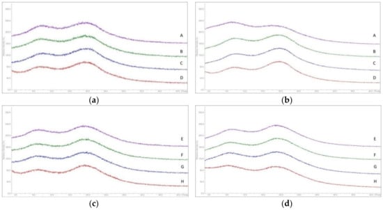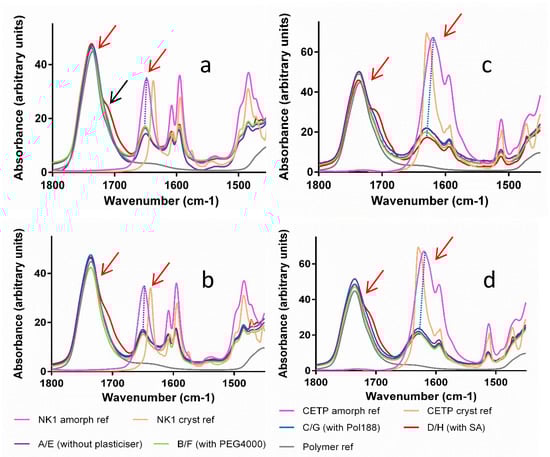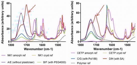 To verify the possible onset of API crystallization we focused on band shifts related to the carbonyl groups (red arrow around 1640 cm−1 in Figure 8), because these peaks are specific for crystalline and amorphous interaction motifs and for both APIs.