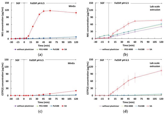 Two-stage dissolution profiles during initial analysis for extrudates containing NK1 derived from MinEx extrusion (a), lab-scale extrusion (b) or containing CETP derived from MinEx extrusion (c), lab-scale extrusion (d).