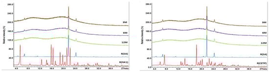 Overlay of XRPD pattern of milled extrudates derived from lab-scale extrusion containing SA. NK1 (left) and CETP (right) samples stored for 3 months (3M), 6 months (6M) and 12 months (12M) at 40 °C/75%RH. The reference spectra of crystalline NK1 (R(NK1)), of crystalline CETP (R(CETP)) and stearic acid (R(SA)) are given as well.