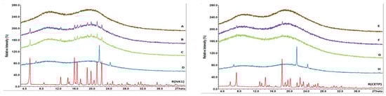 Overlay of XRPD pattern of milled extrudates derived from lab-scale extrusion containing NK1 ((left) (A–D) and crystalline reference R(NK1)) or CETP ((right) (E–H) and crystalline reference R(CETP)), which were stored for 12 months at 40 °C/75%RH. Extrudates without plasticizers are shown in brown (A,E), with PEG4000 in pink (B,F), with Pol188 in green (C,G), and with SA in blue (D,H). The crystalline reference spectra are shown at the bottom with red curves.