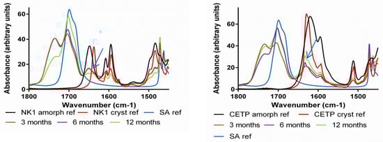 Attenuated total reflection (ATR) FTIR spectra of milled extrudates derived from lab-scale extrusion containing SA. NK1 (left) and CETP (right) samples stored for 3, 6 and 12 months at 40 °C/75%RH. The reference spectra of crystalline and amorphous NK1, of crystalline and amorphous CETP and SA are given as well. The blue arrows show a crystalline motif observed at the position of the NK1 or CETP carbonyl stretching vibration.