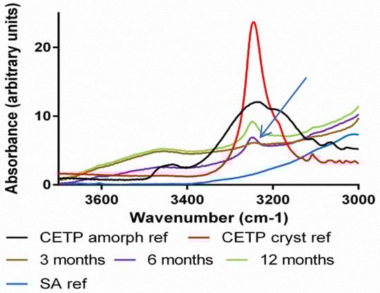 In some cases, the IR spectra revealed crystalline motifs at an earlier time point than XRPD and/or DSC. Crystalline-like IR interactions were observed even in binary CETP extrudates, or also in ternary compositions with SA and already after 6 months storage at 40 °C/75%RH (Table 5). Furthermore, the CETP extrudate with SA was found to have changed after 3 months storage at T = 40 °C, RH = 75%RH. This is documented by changes in the absorption bands in the carbonyl and amine stretching regions, as depicted in Figure 13 and Figure 14 respectively, with blue arrows. However, all these mixtures are found to be amorphous after 12 months by XRPD and DSC, which indicates that the mobility of the API in the HPMCAS matrix is not sufficient to enable growth of detectable crystals, as long as Pol188 and PEG4000 are absent.