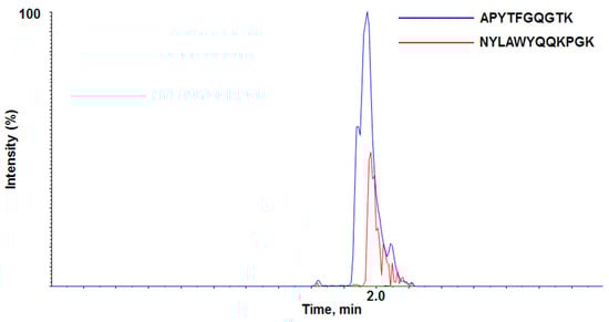 LC-QTOF-MS/MS chromatogram of the two proposed signature peptides.