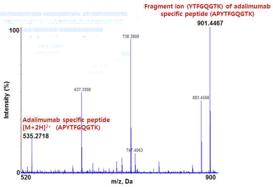 Figure 2 shows the MS/MS spectrum of the adalimumab-specific signature peptide (APYTFGQGTK). From the doubly charged parent ion observed at m/z 535.27, several product ions were observed and the ion at m/z 901.45 showed the best sensitivity and selectivity.