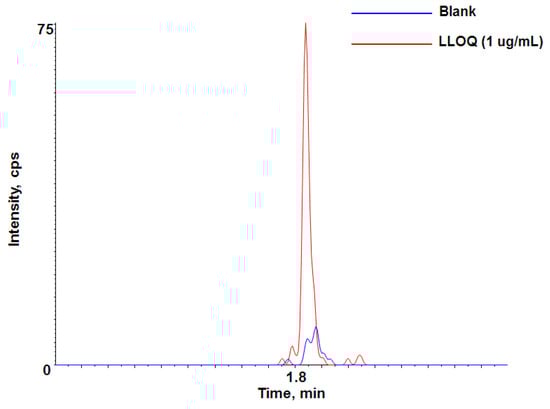 Representative chromatogram of lower limit of quantification (LLOQ, 1 µg/mL) for adalimumab-specific signature peptide in rat plasma.