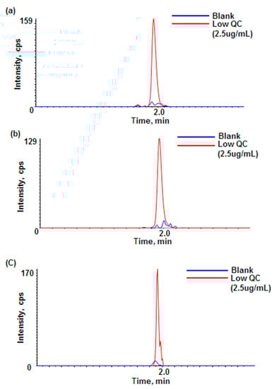 Comparison of peak intensities between blank and QC low in plasma: (a) blank and QC low in rat plasma; (b) blank and QC low in mouse plasma; (c) blank and QC low in monkey plasma.